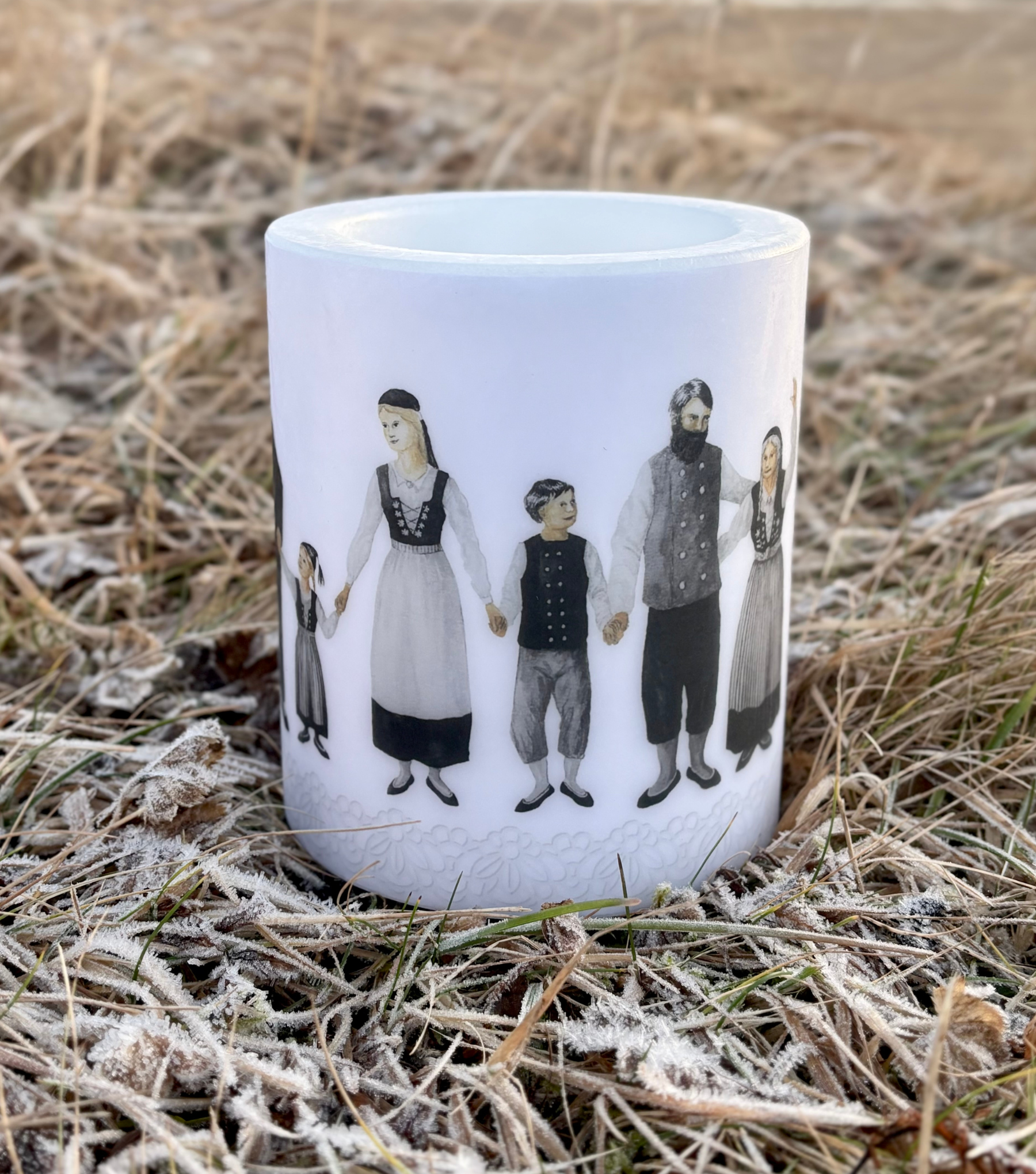 A beautiful candle line featuring an illustration of a family in Icelandic national costume.